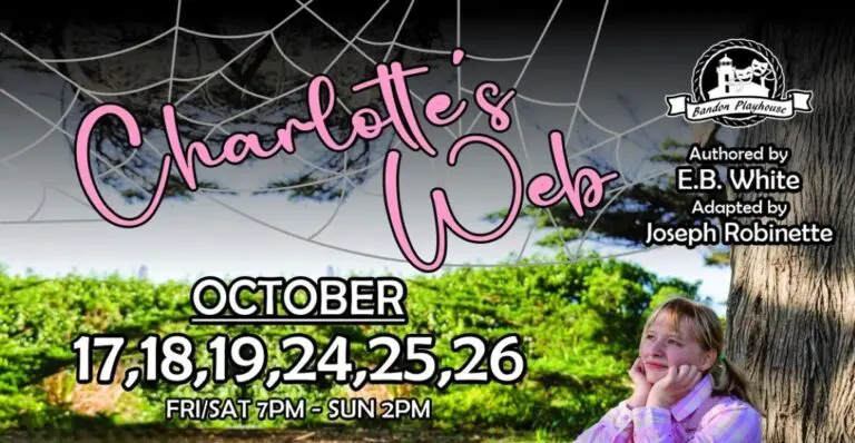 The Bandon Playhouse presents “Charlotte’s Web” at the Sprague Community Theater. Since 1976, Bandon Playhouse has enriched the community with diverse theater productions with volunteers that ensure the performing arts remain vibrant and accessible on the Southern Oregon Coast. Adapted from E.B. White’s beloved children’s novel, this production brings the classic 1952 book’s wonder and delight to life.